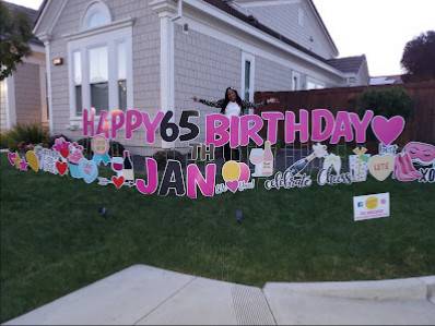 Contacted Hooray! Yard Cards East Bay, Gail was the contact. Her personality was fantastic. This was a surprise 65th for my wife and Gail explained the business and started asking me questions to develop a profile for the front yard display. While my wife was away, Gail arrived and within 30+ minutes, she created this incredible gift for my wife. THANK YOU Gail. Gail is in photo #2, she is a blast to have worked with. So many of our friends drove by and complimented the creation and asked for the business contact. I highly recommend Hooray! Yard Cards East Bay to celebrate any life event.